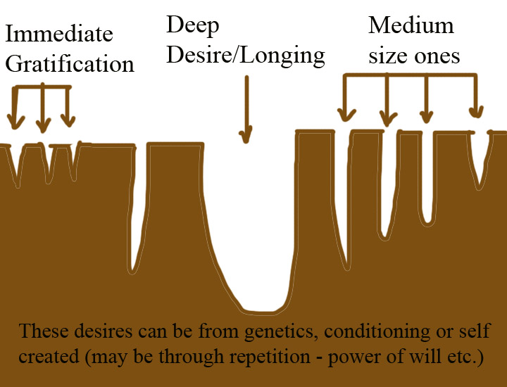 In my experience, I’ve noticed that we use our thinking process/conceptualizations to create trenches that we try to fill. A desire is kind of like a trench, the deeper the trench the harder we try to fill it up.