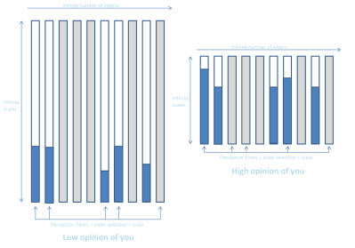 Now, lets take it to the next level. This thing happens in every interaction warping the sliders in scale and choice. The blue bars on sliders show that they have been selected. The gray ones are the inactive ones. Interacting with another person may open up a new set of sliders and scales. The overall patterns uncovered after interacting with varied people for a long period of time imprints itself as a self image in our subconscious memory.