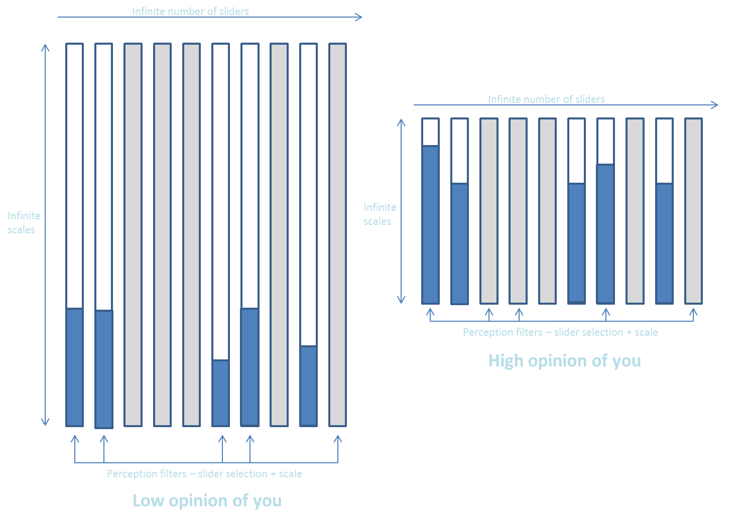 Now, lets take it to the next level. This thing happens in every interaction warping the sliders in scale and choice. The blue bars on sliders show that they have been selected. The gray ones are the inactive ones. Interacting with another person may open up a new set of sliders and scales. The overall patterns uncovered after interacting with varied people for a long period of time imprints itself as a self image in our subconscious memory.